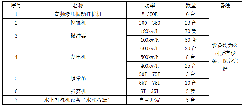 公司在地基地基与基础专业施工,为本公司的始创施工专业,尤其是在振冲地基施工方面具有十分丰富的施工经验,业绩突出,具有较好口碑,在地基地基与基础专业施工方面投入的主要设备有: